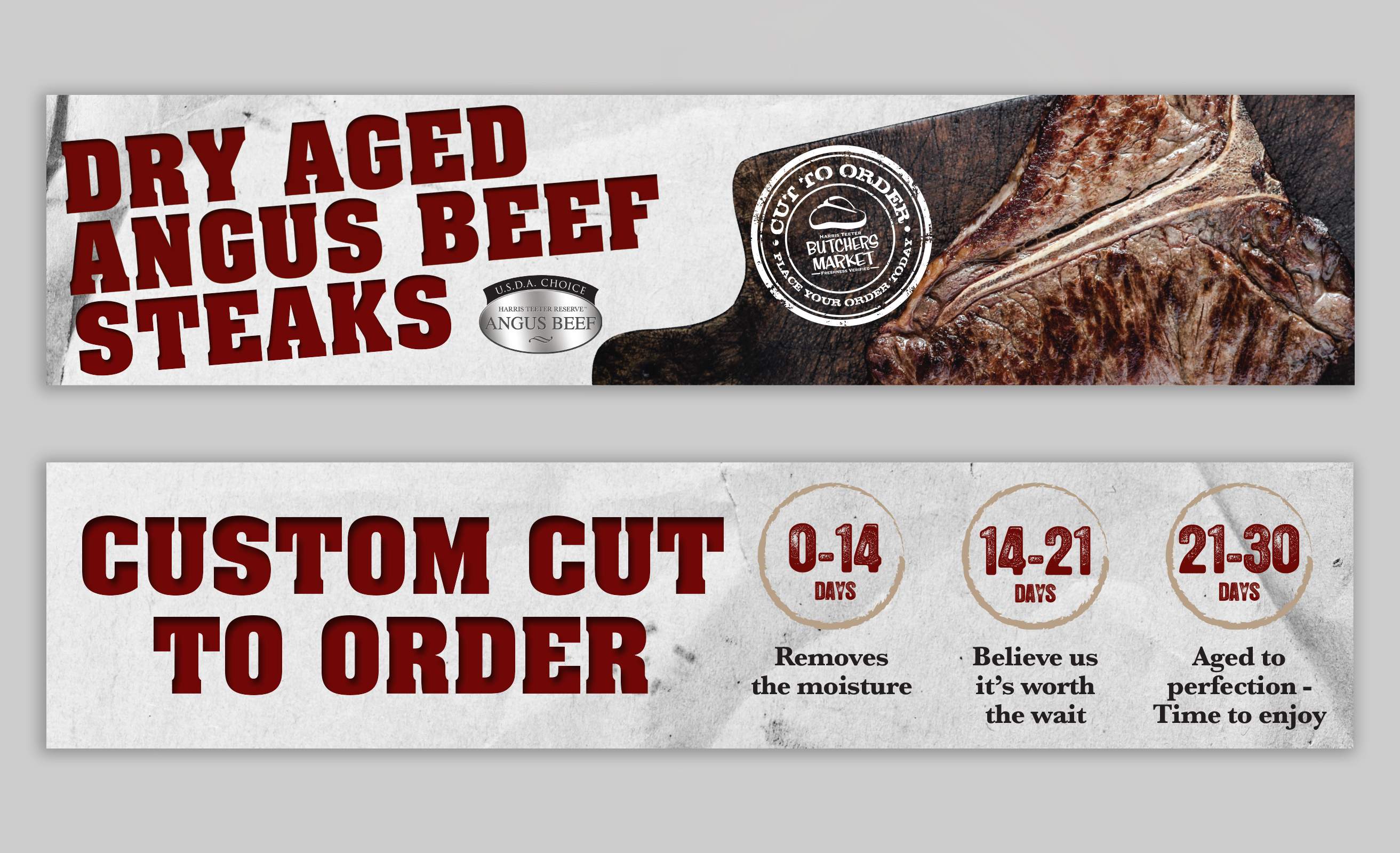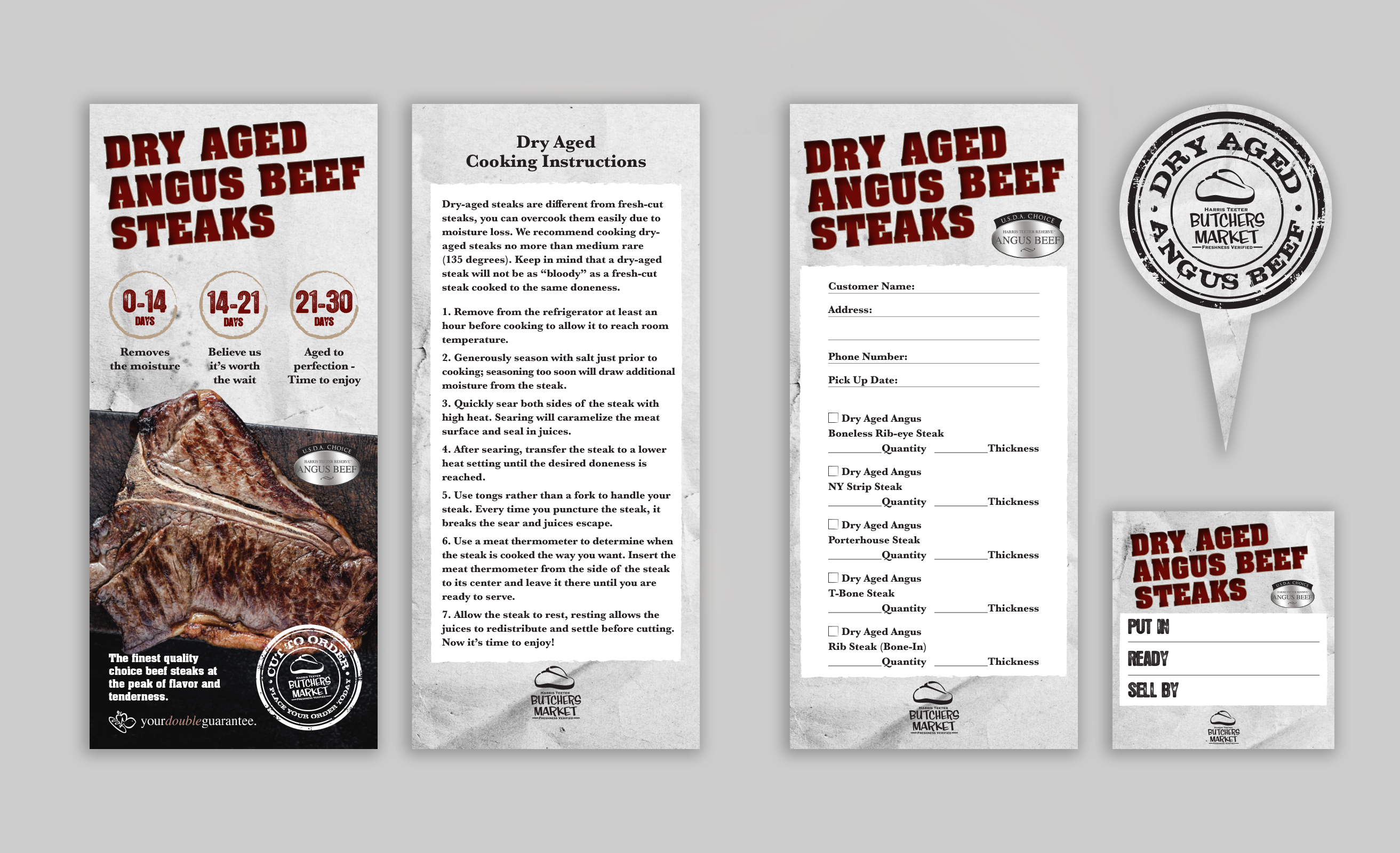 Harris Teeter’s Butchers Market needed a fresh update for their Aged Beef program. I reduced the amount of text from the previous designs and focused more on the attributes and lightened up the background color from dark red to a more marble white color. The following items were needed for the stores: