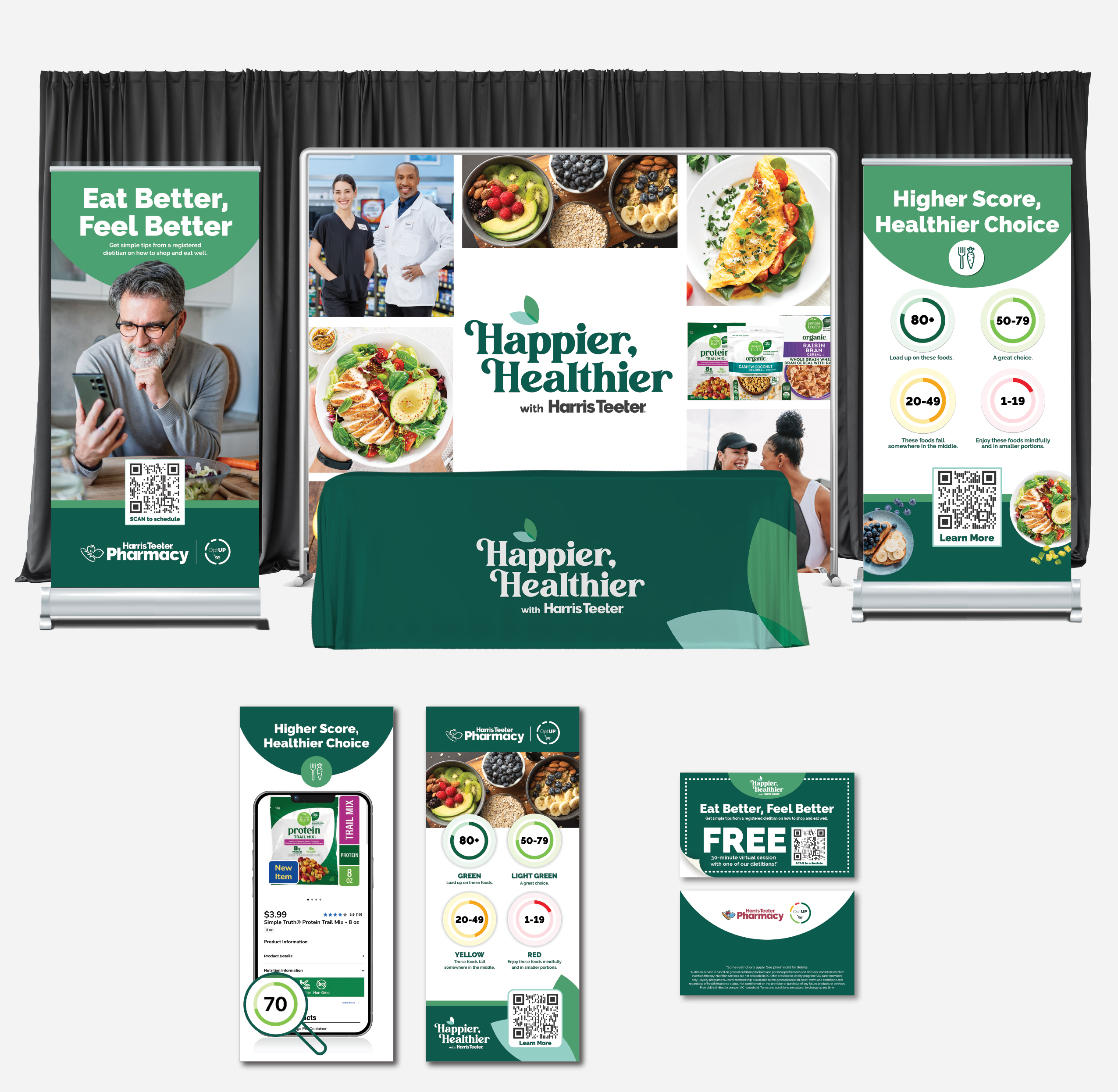 Happier, Healthier with Harris Teeter is a new campaign for 2026, from fresh produce to pharmacy, Harris Teeter finds better-for-you choices to live well your way. I created a kit of elements that the Pharmacy team can take with them to future events like trade shows and conferences. I designed these elements: tablecloth, step & repeat, handouts, a coupon for a free dietitian visit, and banners.